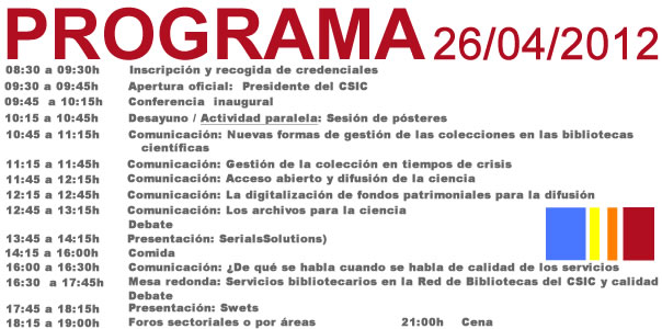 Con el fin de abordar adecuadamente las transformaciones que se producen continuamente en la gestión de la información científica y analizar los cambios que conllevan en la profesión bibliotecaria se convocan para los días 26-27 de abril de 2012 las Cuartas Jornadas de Análisis de la Red de Bibliotecas del CSIC bajo el lema "Bibliotecas para la Ciencia en el siglo XXI: nuevos entornos y retos profesionales" con el objetivo de debatir los temas que en la actualidad preocupan a las bibliotecas del CSIC, con especial atención a la calidad de los servicios a los usuarios y las necesidades de adaptación del personal bibliotecario.