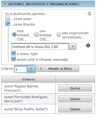 Ahora, desmarcamos la opción "...como autor" y marcamos "...como filiación". Por defecto estará seleccionada "esta entidad CSIC". En su campo, escribo el nombre del instituto y lo selecciono entre los resultados. En el desplegable "Criterio", cambio al criterio "y" y pincho en añadir al filtro: