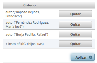 En la tabla resumen aparecerá una línea por integrante y una adicional del instituto con el prefijo "+". Pincho en el botón "Aplicar" para que se apliquen todos los filtros en el listado: